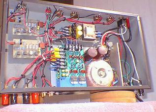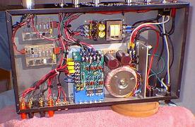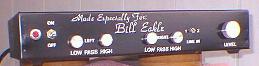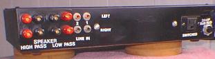 On this page are four pictures of Bill's four channel, active crossover power amp used with his "Marriage Made in Heaven" computer multimedia system. The amplifier uses all Marchand boards, a PS24 amp power supply, two stacked PM21 dual power amps rated @ 65 watts/channel, a PS10 power supply and two XM1 crossover boards. This amp has two selectable inputs for the addition of a tuner or other source later. There is a master level control so it isn't necessary to use the computer software to adjust the level, and level controls for the high and low pass outputs on right & left channels. Bill comments "There is no cost estimate as the Marchand boards are available anywhere from manual only, board only to fully assembled. Boxes vary widely also, some surplus stores will practically give boxes away, you will have to make a new front and rear panel from scrap sheet metal, etc. etc. This was probably overkill for a computer sound board, but it was fun". The rear panel with the in/outputs, fuse and switched