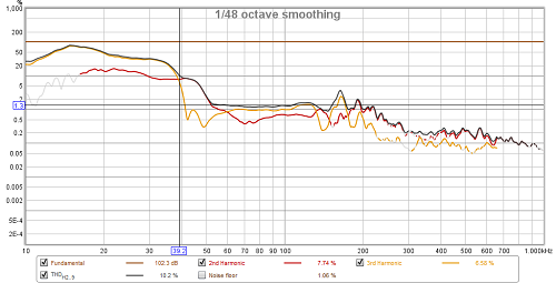 I also took the opportunity to perform some linearity and distortion testing on the rebuilt subwoofer, and I'm quite satisfied with the results. THD breached 10% at the lower end of the passband with the equivalent of about 70 Watts of input, almost exactly where Hornresp predicted it would happen, and higher up in the passband the THD dropped significantly. This was going to be a very clean-sounding subwoofer, all the way up to its limits.