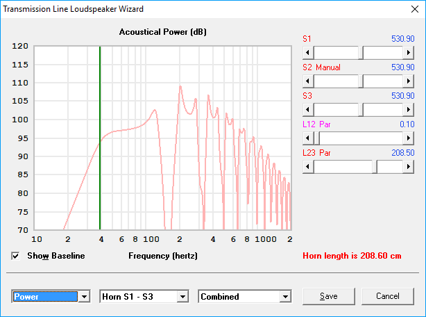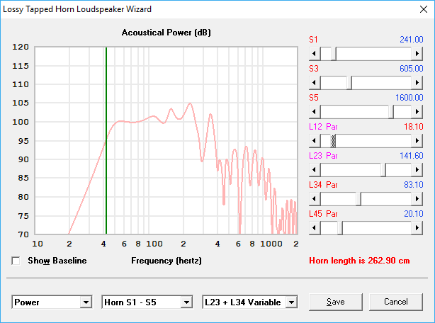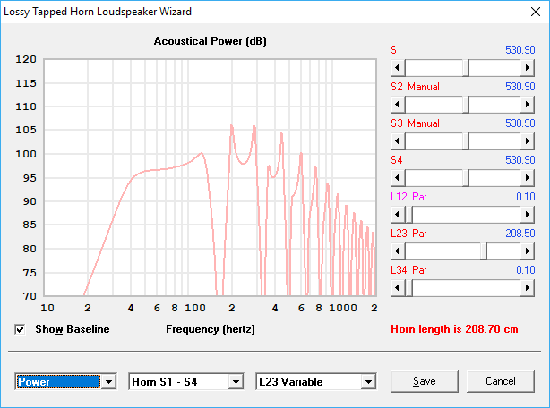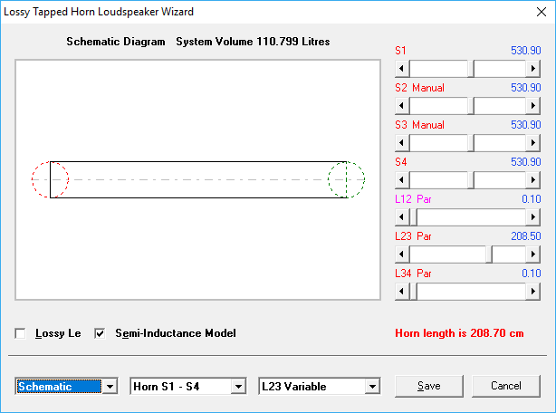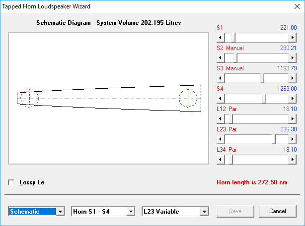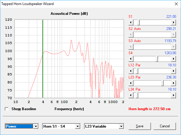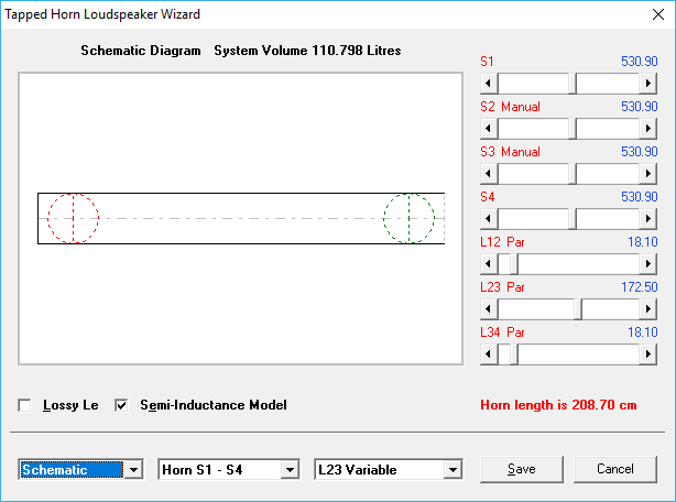 Now, we need to adjust the length and taper of the line to achieve the flattest frequency response. To do this, we're going to set the calculation for S2 and S3 to "Auto" (by double-clicking where it says "Manual"), and basically adjust S1, S4 and L23 (and L12 and L34 if necessary) until we get something useful, e.g. a reasonably flat response, decent power-handling and out of band response peaks that are not significantly higher than the usable passband. Illustrated below is just one possible tapped horn alignment for this particular driver that meets most of these requirements.