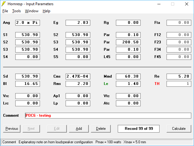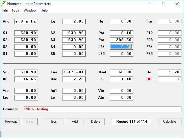 As is expected with the use of an end-load design like this one, there's this massive notch in the response between 100 Hz and 200 Hz. Now, let's see if we can deal with that notch by using a tapped horn alignment instead. First, let's change the Hornresp sim to that of a tapped horn. To do this, we're going to add values for S4 and L34, change the L34 expansion to "Par" and change the type of simulation from OD (offset driver) to TH (tapped horn).